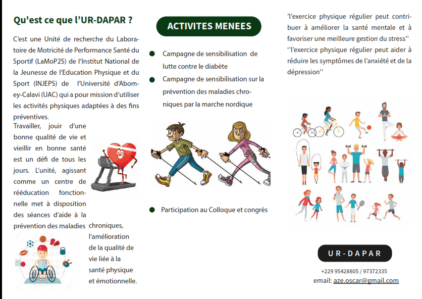 L’Unité de Recherche « Déficiences, Activités Physiques Adaptées et Réhabilitation » (UR-DAPAR) fait partie du Laboratoire Motricité Performance et Santé du Sportif (LaMoP2S) de l’Institut National de la Jeunesse et de l’Éducation Physique et du Sport (INJEPS) à l’Université d’Abomey-Calavi (UAC). Elle est dirigée par Pr AKPLOGAN Barnabé Professeur Titulaire des Universités de CAMES et Dr AZE Oscar, Maitre Assistant des Universités de CAMES, Docteur en Motricité Humaine et Handicap. Elle focalise ses recherches la Biologie, la Médecine, la Santé, et plus spécifiquement sur la Motricité Humaine et le Handicap. Deux axes principaux de ses recherches ont fait objet de productions scientifiques et s’intitulent comme suit :